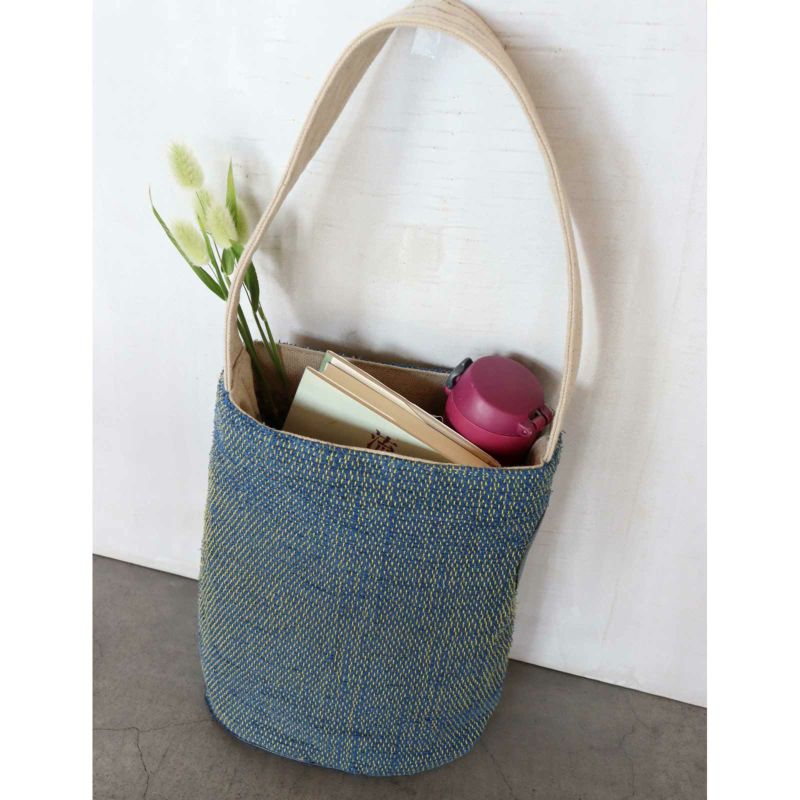 BAN INOUEの「裂き織」シリーズは、蚊帳の日常着を作る過程でどうしても出てしまうあまり布を、糸状にカットし、時間をかけて一段一段丁寧に織りあげました。