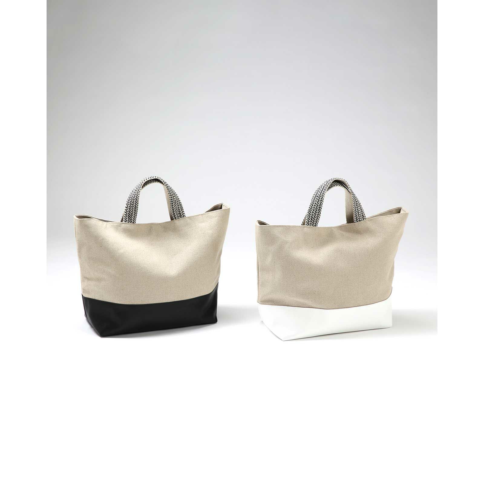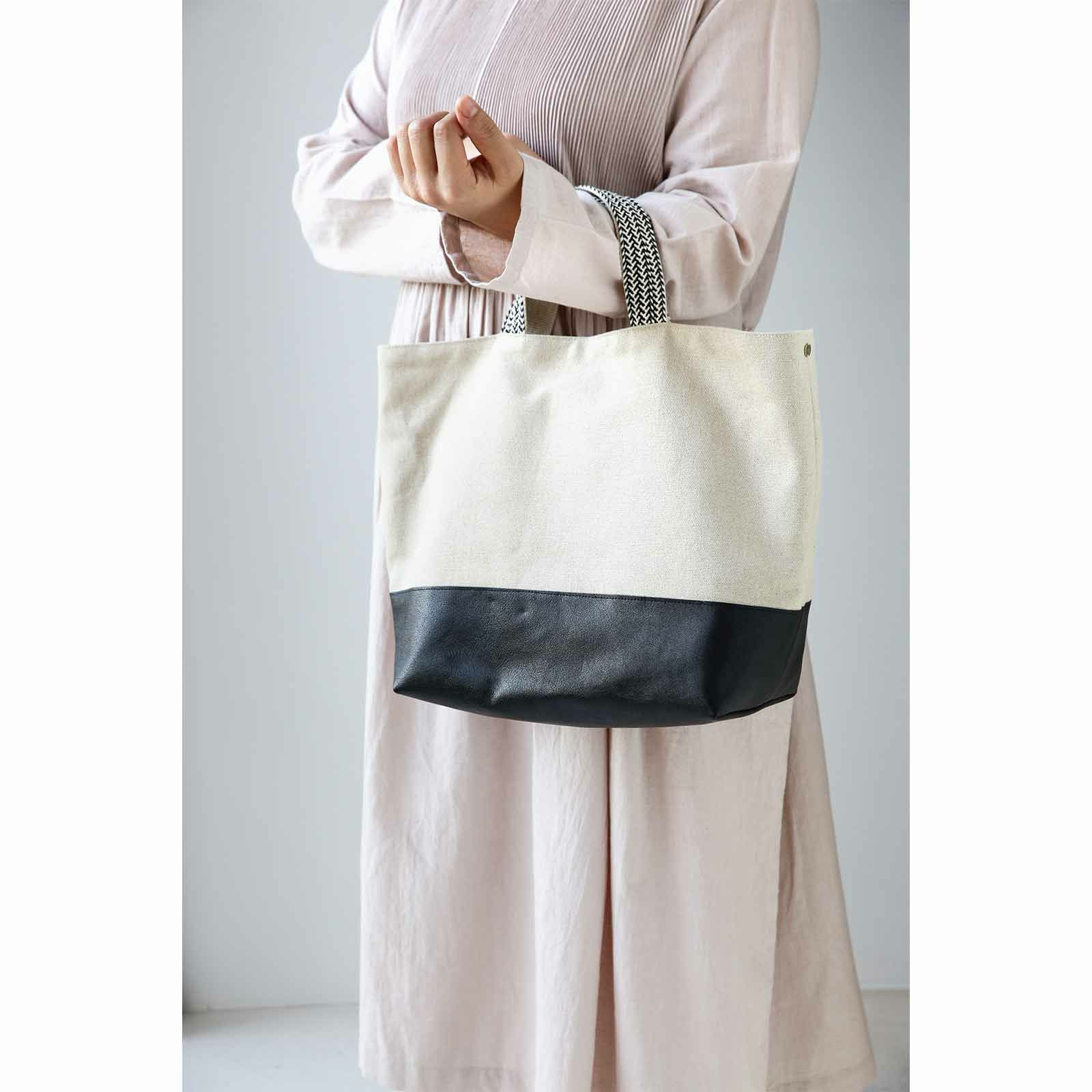底部分には牛革を合わせ、持ち手にはモノトーンの織りテープを合わせた、ポイントの効いたシンプルながらも目を引くデザイン。