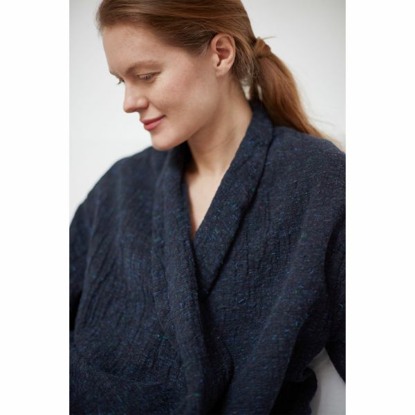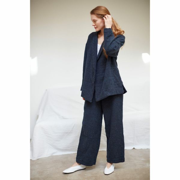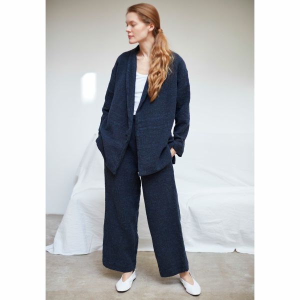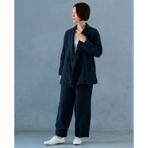 天然素材ならではの優しい肌触りがありつつ、スッキリとしたラインで着ぶくれすることのないジャケット。