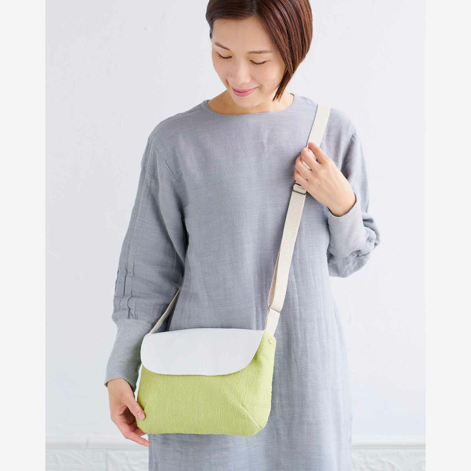 蓋部分には牛革を合わせ、ショルダー紐には麻のテープを合わせました。