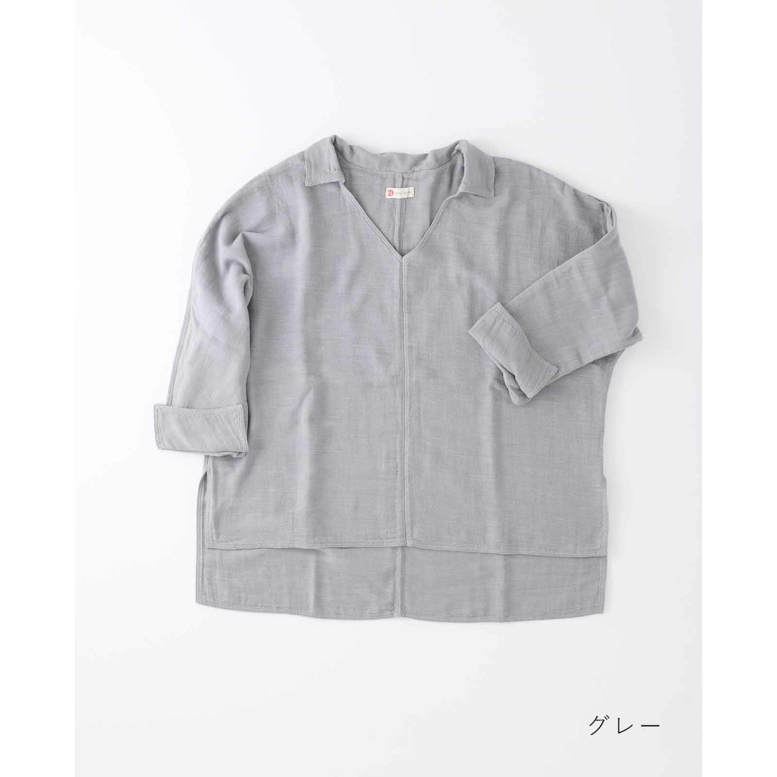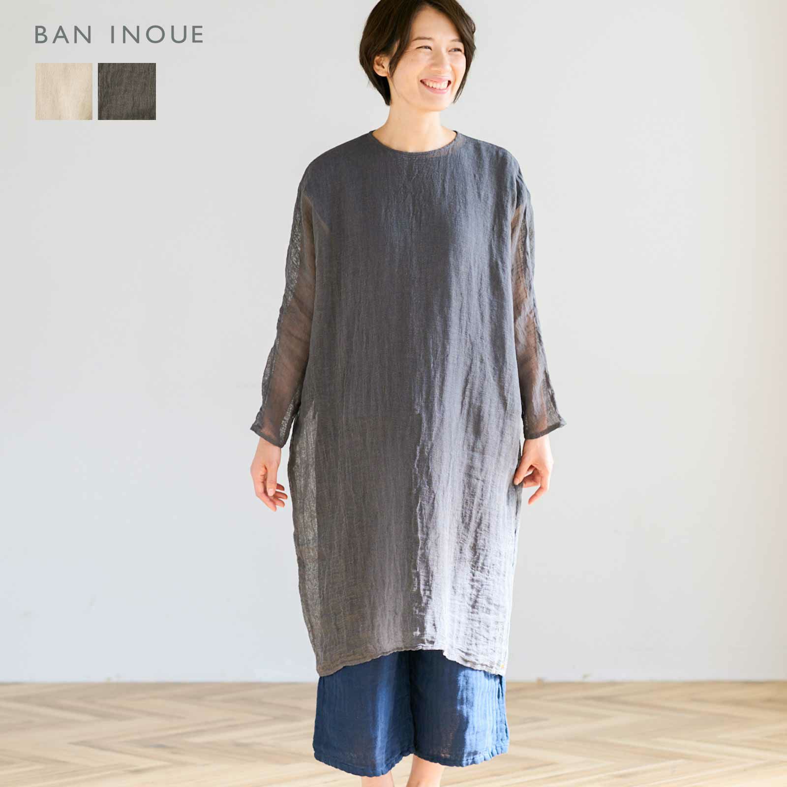 ゆったりと着心地の良い、薄手のワンピース。ボトムスには「かやフレアパンツ」を合わせて。