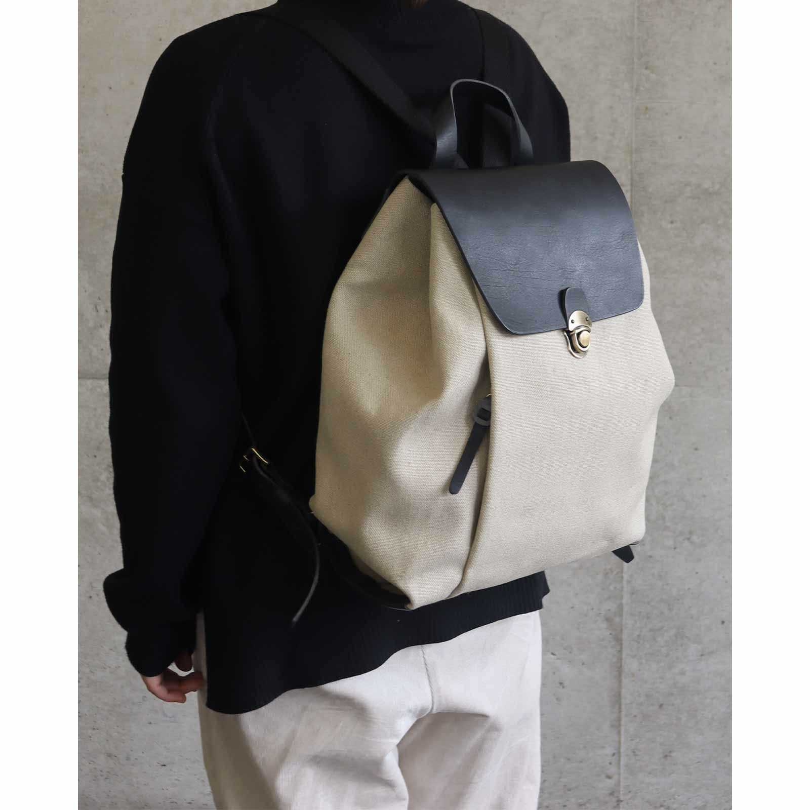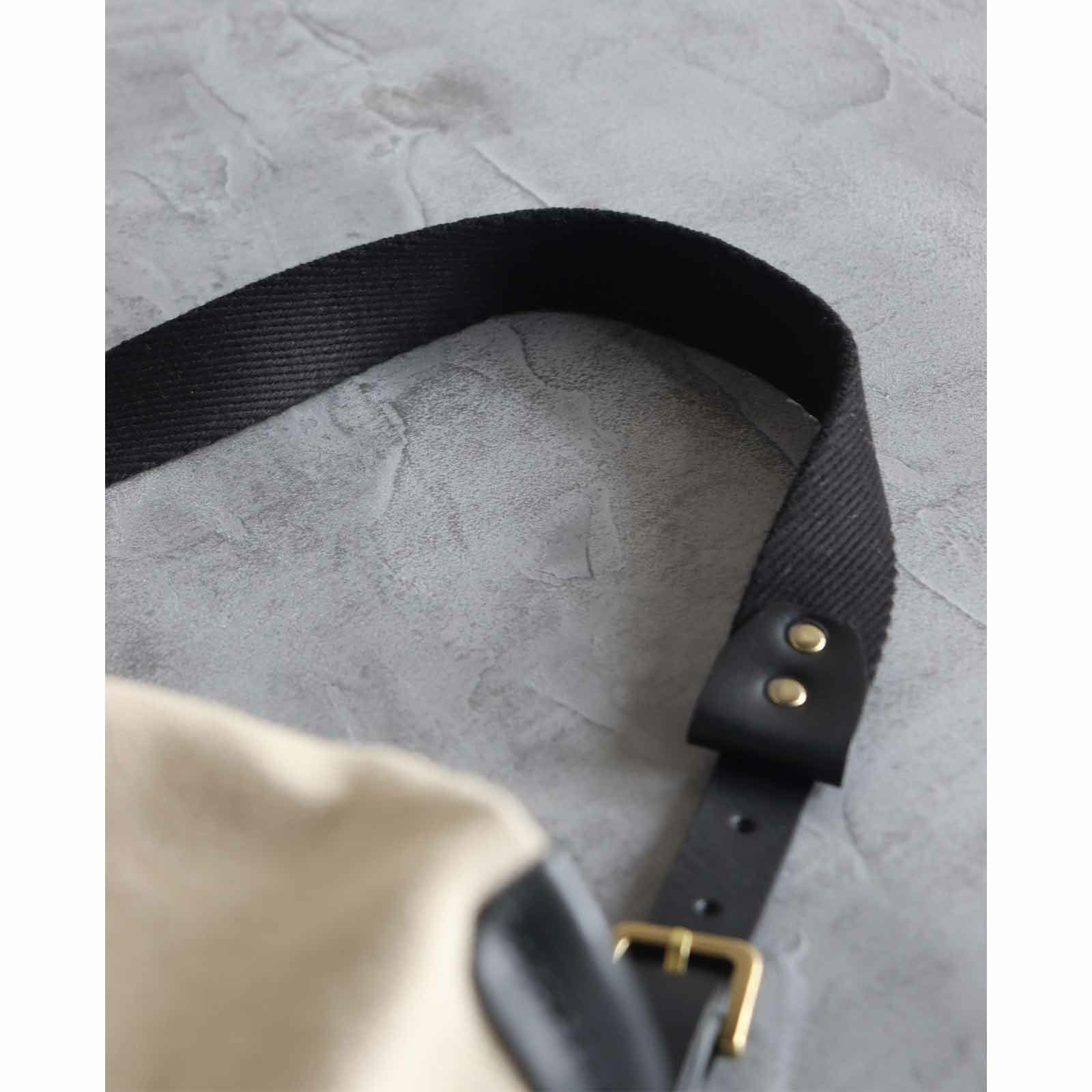 リネン帆布の生地感と、ハリのある黒のレザー(本革)のコントラストで