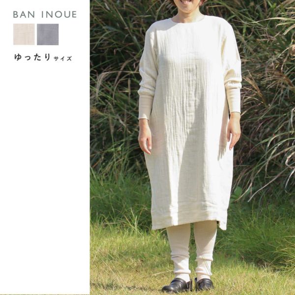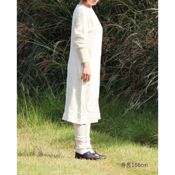 オンラインショップ・直営店限定サイズは、通常の「スラブ袖リブワンピース」よりも身丈+14cm・身幅+7cmほどで、ゆったりおおきめ。