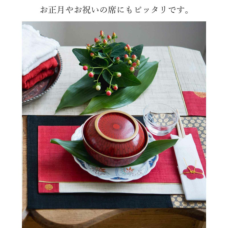 手織り麻の生地を型抜きし、ひとつひとつ手づくりした梅飾りが付いています。