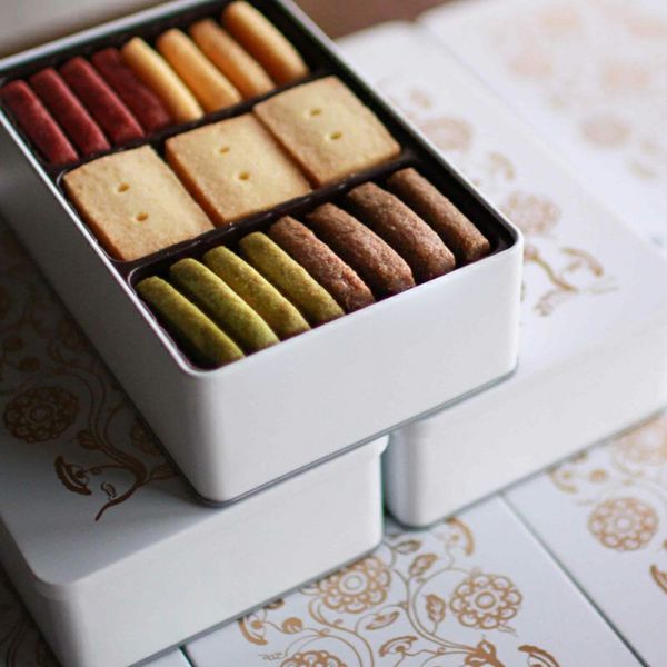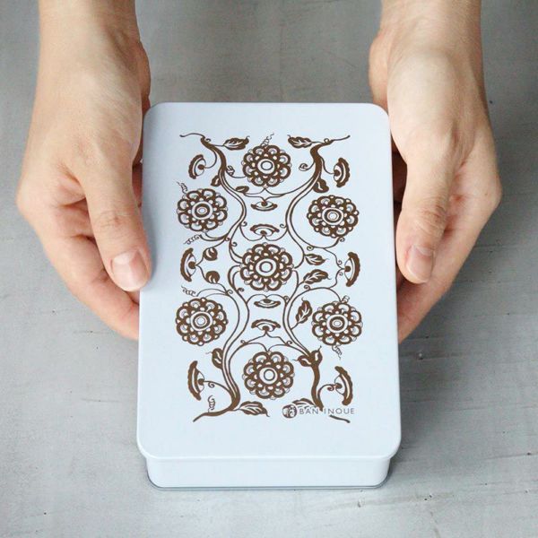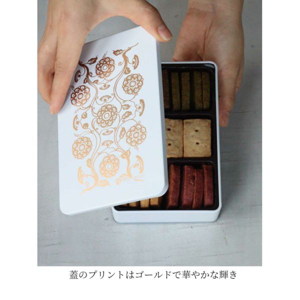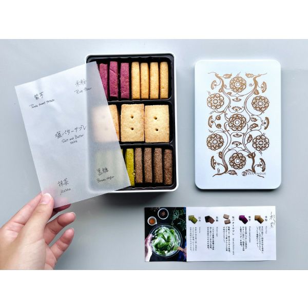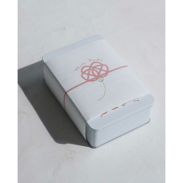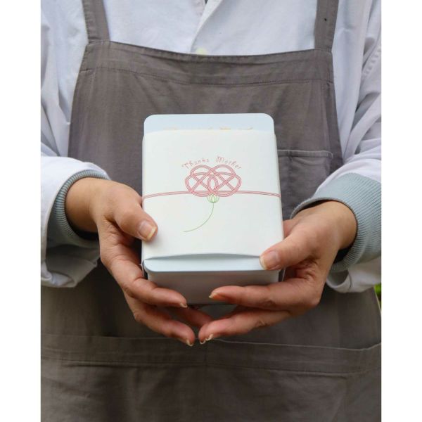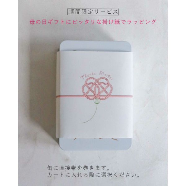 井上千鶴による墨描きデザインの和紙でお包みします。和紙は季節により色が変わります。お届け時はこの上から梱包材で巻いております。クッキー缶商品ページにて、カートに入れる際にオプションをとしてご選択ください。