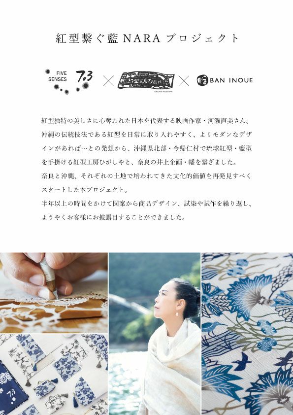 沖縄の伝統技法である紅型を日常に取り入れやすく、よりモダンなデザインがあれば…との発想から、沖縄県北部・今帰仁村で琉球紅型・藍型を手掛ける紅型工房ひがしやと、奈良の井上企画・幡を繋ぎました。