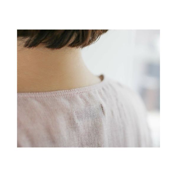 • 蚊帳は荒目織りのため、織り上がりの生地は糊が付着しています。洋服は縫製の後、製品洗いをしていますが、糊のごわつきは残っています。