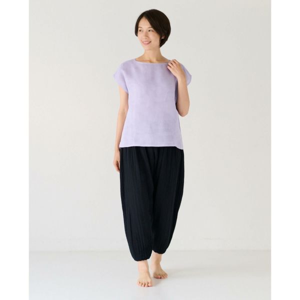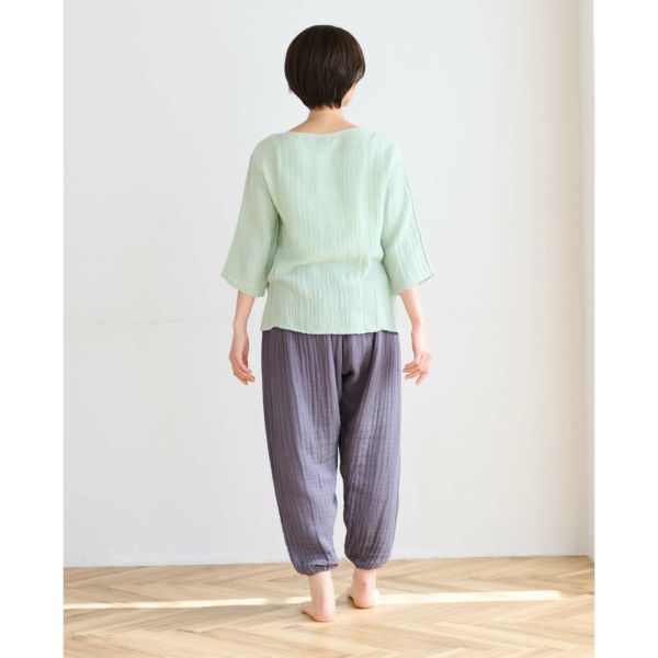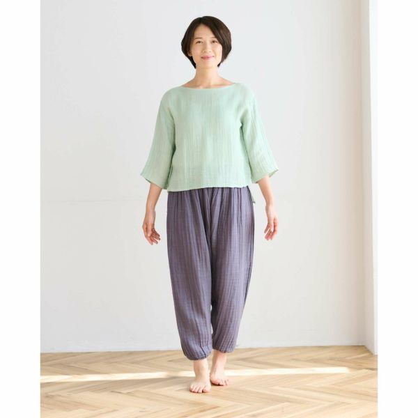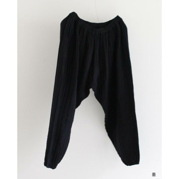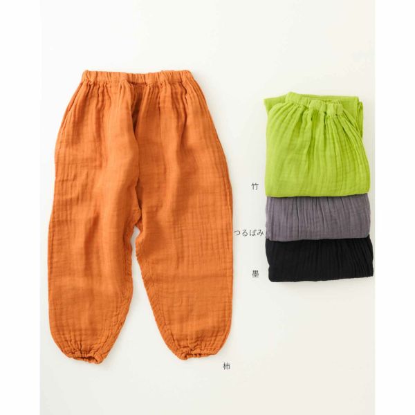 モンペパンツは、裾をゴムできゅっと絞っているのが特徴的。 他のかやパンツよりも、 すっきりとしたシルエット、 かつカジュアルな雰囲気です。 階段やしゃがんだりする場面で、裾を踏む心配がないのも◎ ワンピースと合わせて、 レギンスパンツとして穿くのもおすすめです。