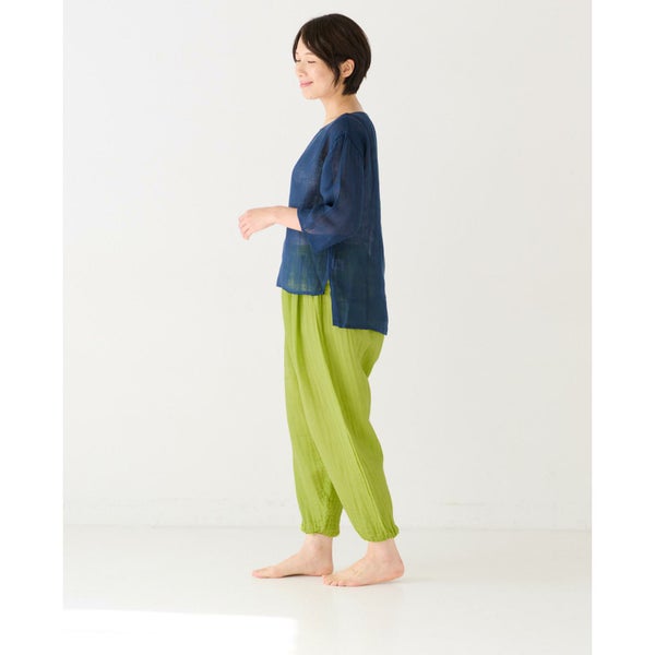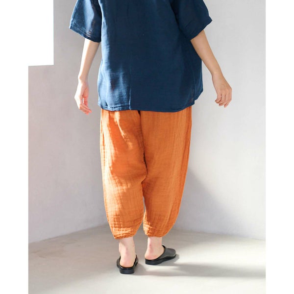 モンペパンツは、裾をゴムできゅっと絞っているのが特徴的。 他のかやパンツよりも、 すっきりとしたシルエット、 かつカジュアルな雰囲気です。 階段やしゃがんだりする場面で、裾を踏む心配がないのも◎ ワンピースと合わせて、 レギンスパンツとして穿くのもおすすめです。