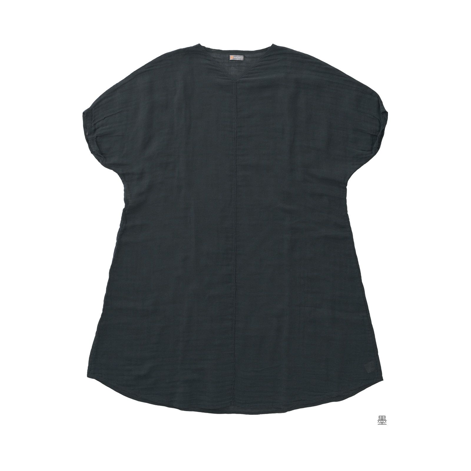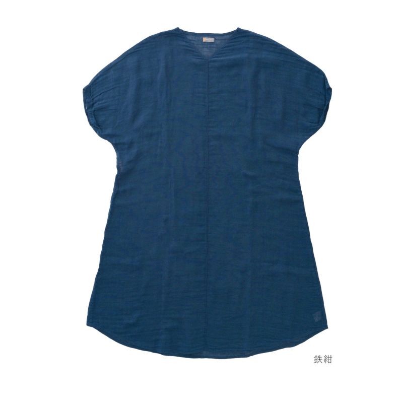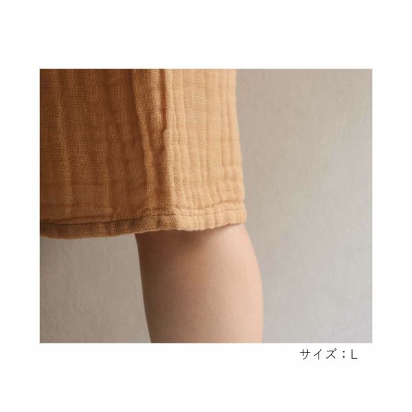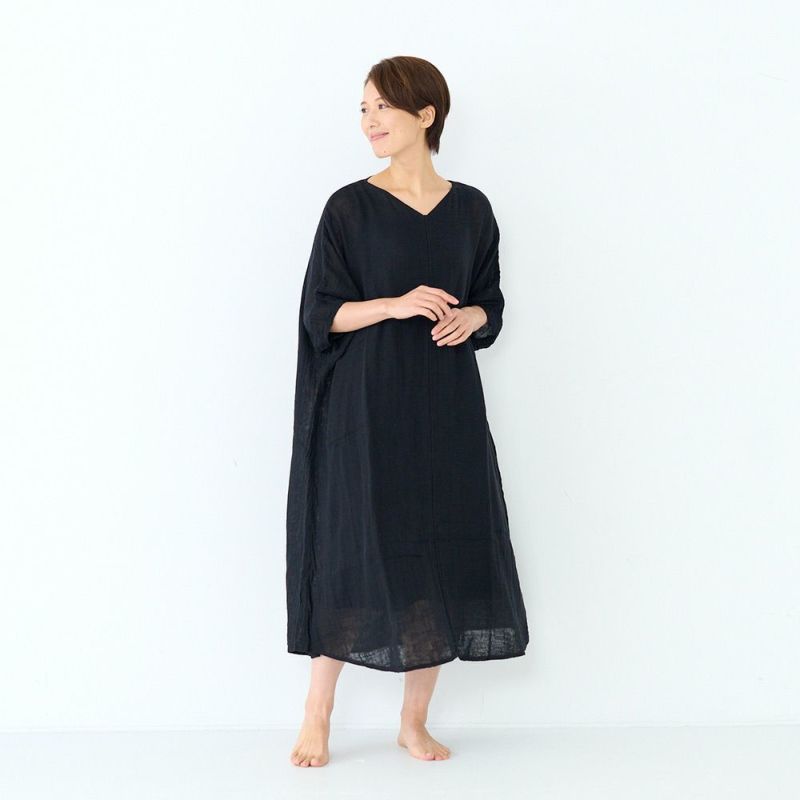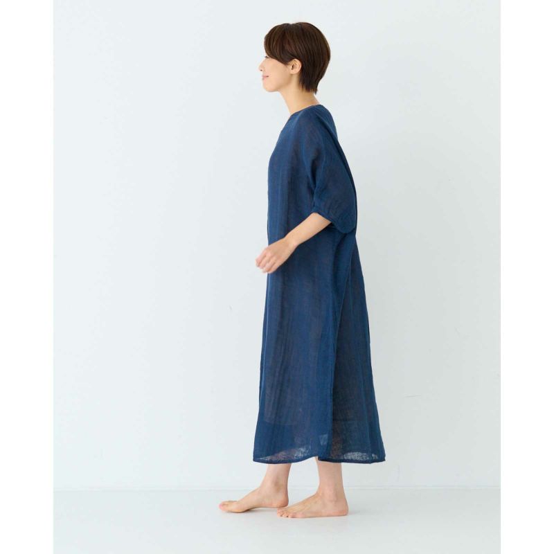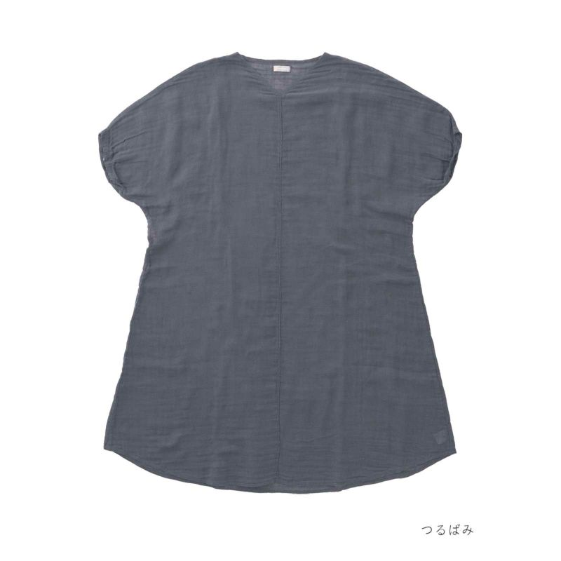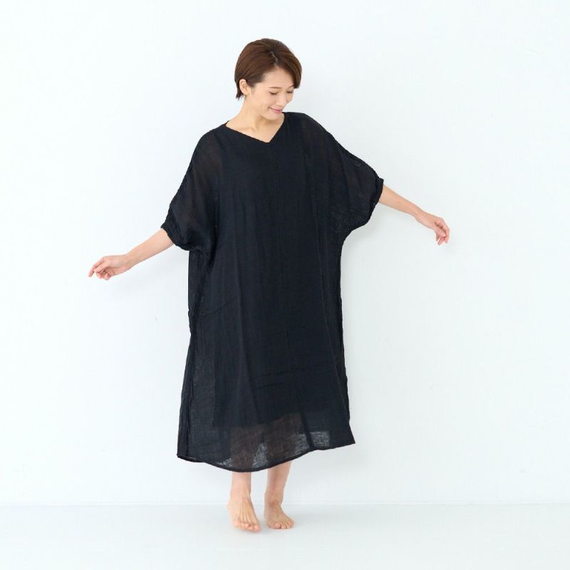 ゆったりと着心地の良い、薄手のワンピース。ボトムスには「かやフレアパンツ」を合わせて。