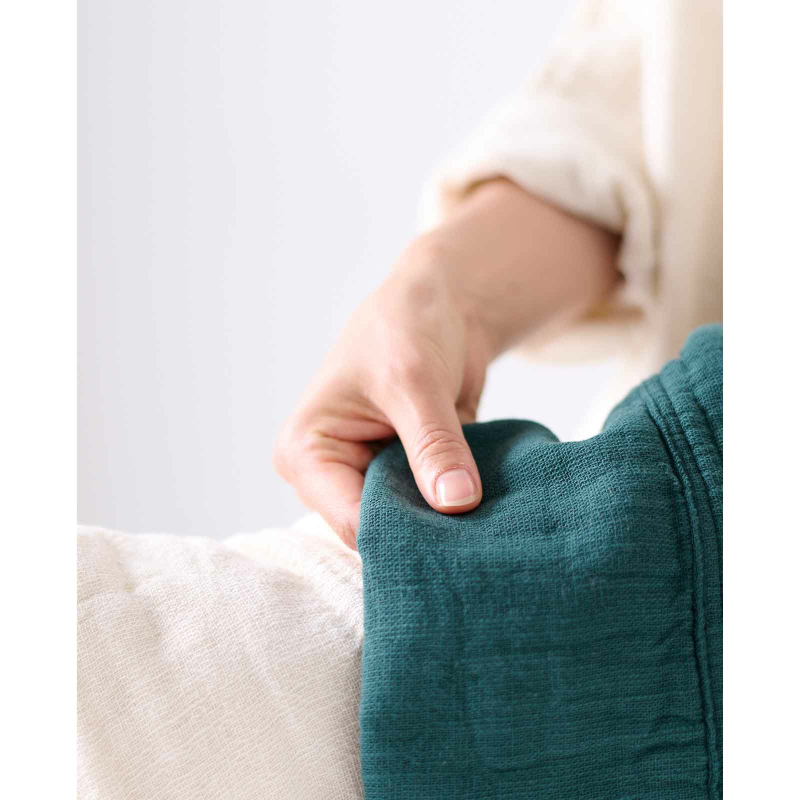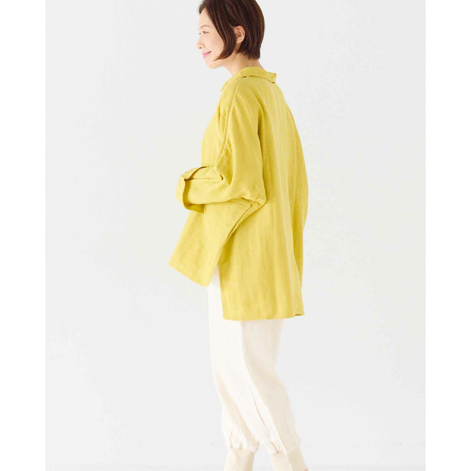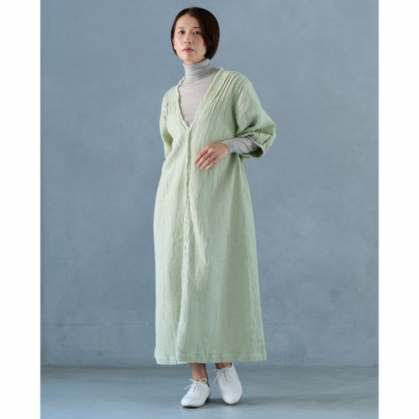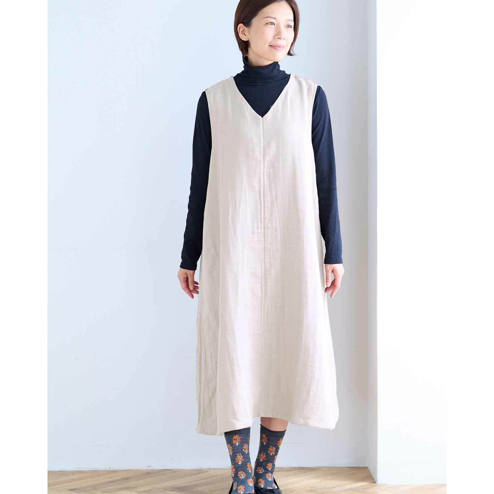 ゆったりと着心地の良い、薄手のワンピース。ボトムスには「かやフレアパンツ」を合わせて。