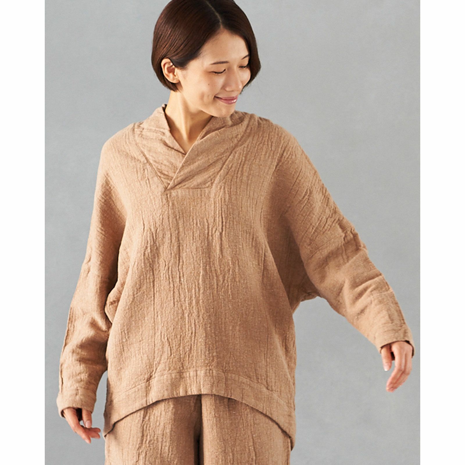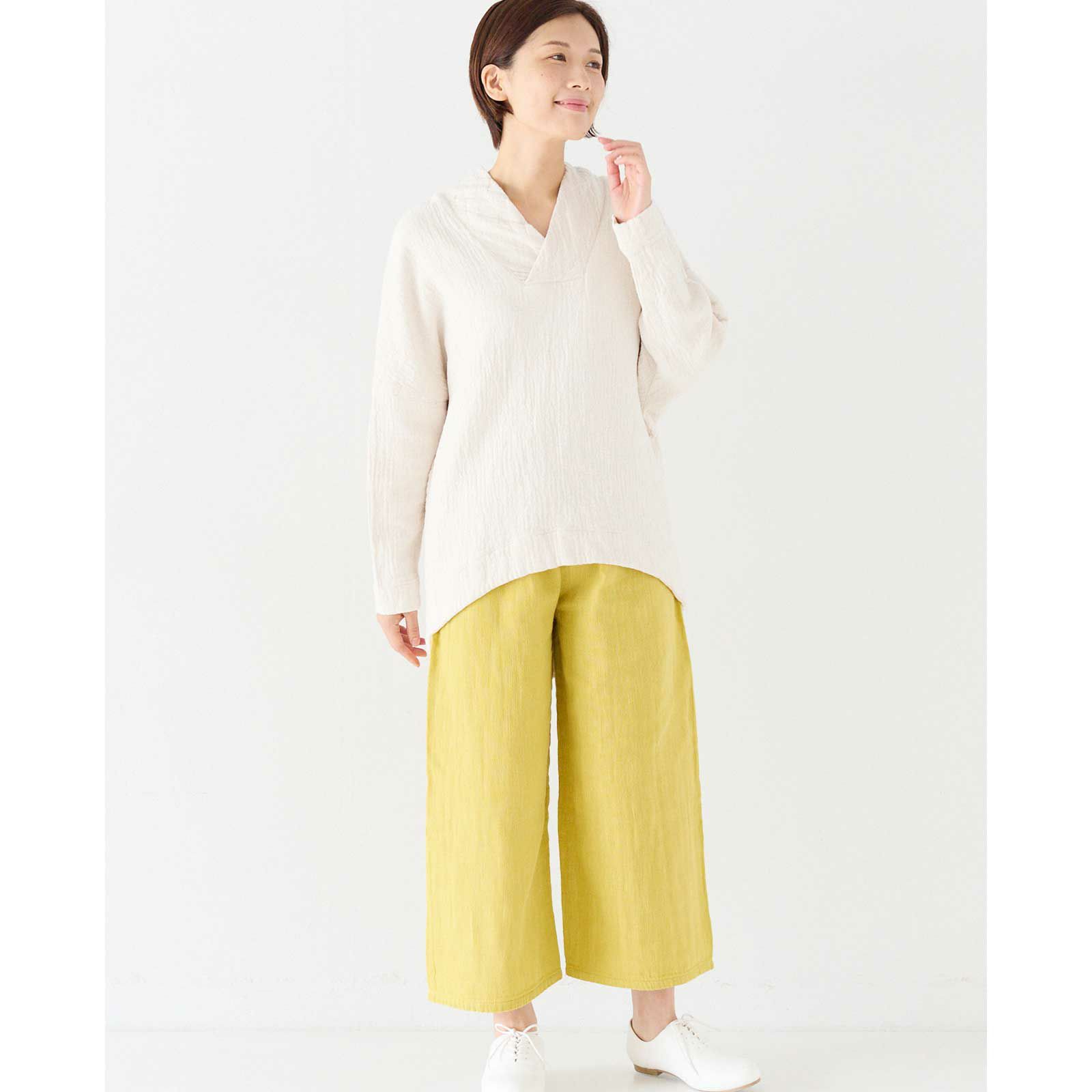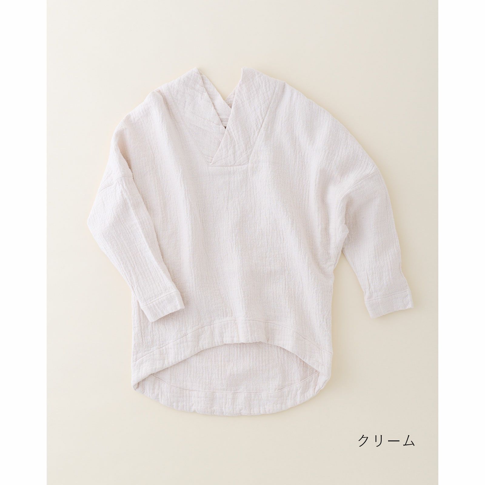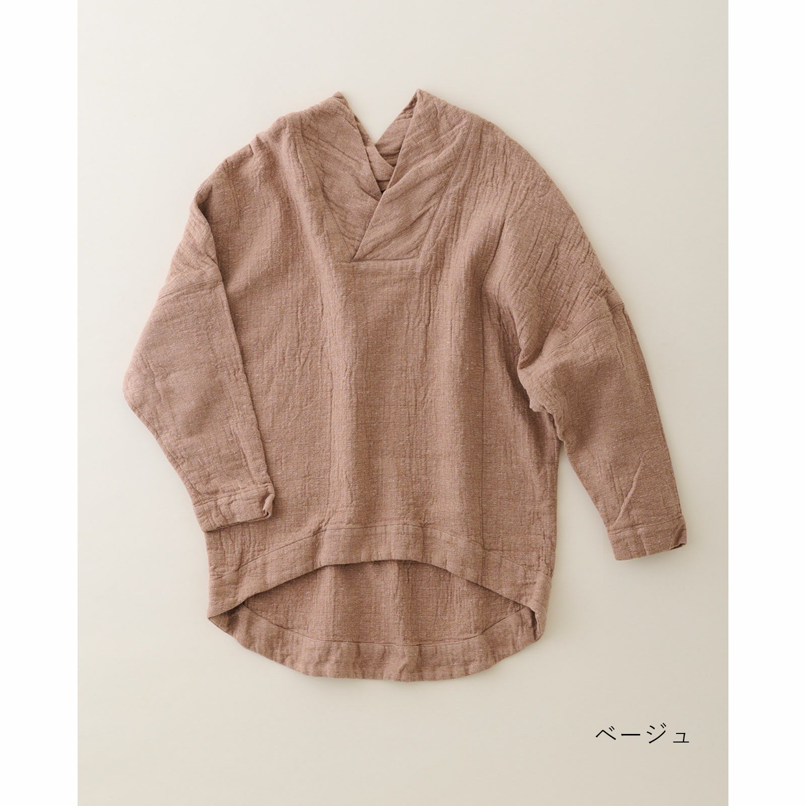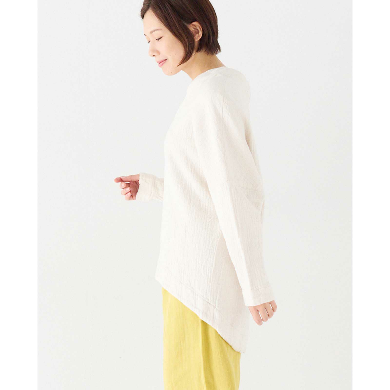 襟部分が特徴的なポイント、ヒップまで隠れる長さのトップスです。
