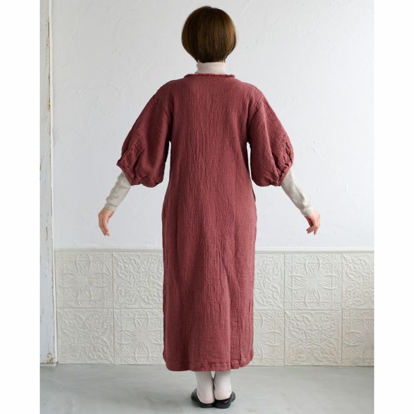 ボリューム感のある袖が可愛らしい、ゆったりとしたシルエットのロングワンピース。