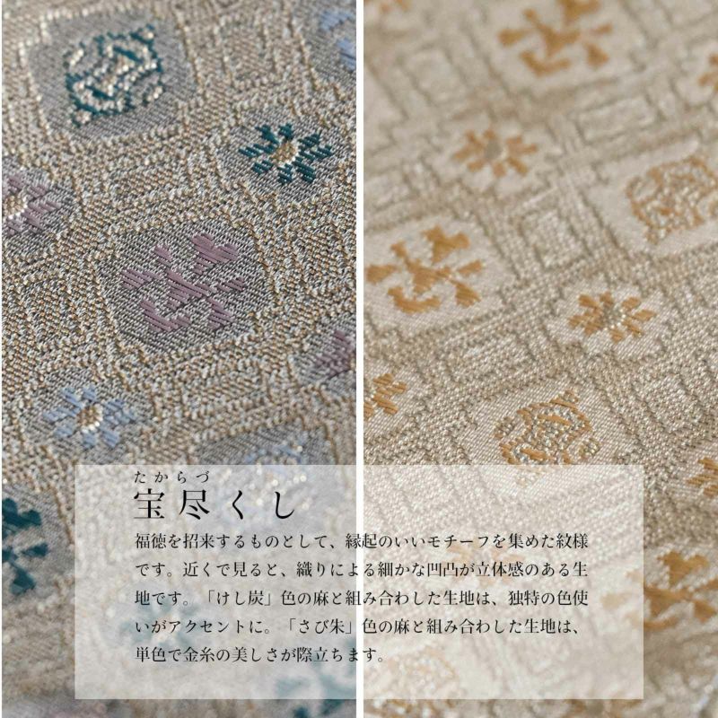 福徳を招来するものとして、縁起のいいモチーフを集めた紋様です。近くで見ると、織りによる細かな凹凸が立体感のある生地です。「けし炭」色の麻と組み合わした生地は、独特の色使いがアクセントに。「さび朱」色の麻と組み合わした生地は、単色で金糸の美しさが際立ちます。