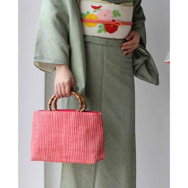 縞や格子の柄に織り上げた麻と竹手を使ったハンドバッグです。