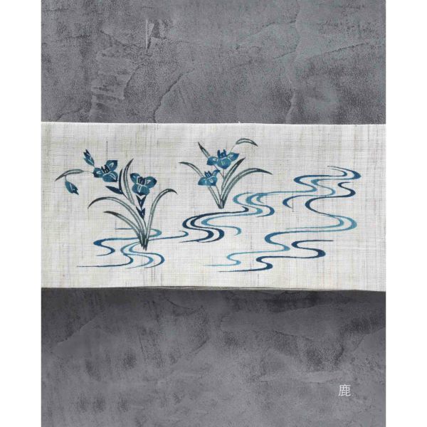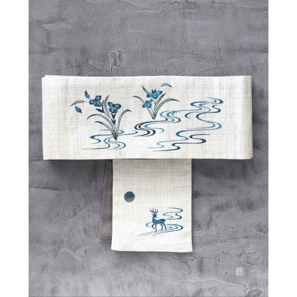 日本を代表する映画作家・河瀨直美さんのコンセプトブランドFIVE SENSES 703セカンドコレクションとして、特に力を入れたのがこの半幅帯。ゆるやかな流水に揺れる菖蒲にはさわやかなブルーを、草花をちりばめた可愛らしい柄には、琉球紅型らしい鮮やかな色彩を採用しました。