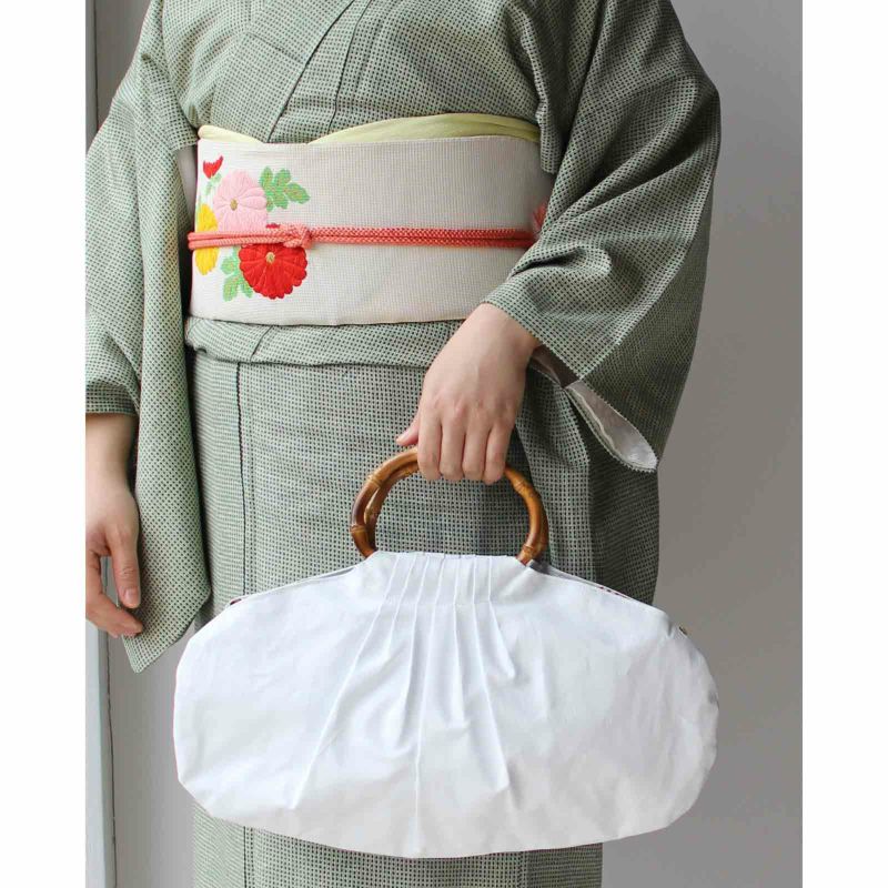 白購入。買ってよかったです。持ち手が竹なので握った汗も気にならず、拭けばOKなので手入れもラクです。けっこう入るのに元が軽いため嬉しい!内側ポケットも欲しい大きさ欲しい数♪ギャザーのデザインやチラ見えする内生地が可愛い!布より丈夫ですし多少の汚れや濡れも拭けばいいのは優秀。着物はもちろんだと思いますが普通の洋装でも違和感なく持ち歩けるデザインだと思います。非常に気に入っています。