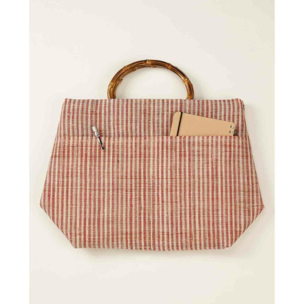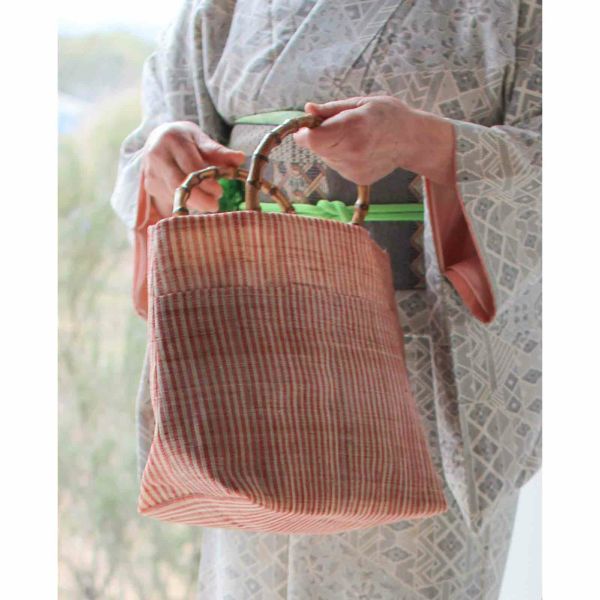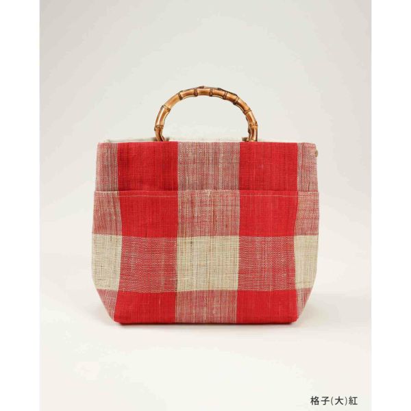 縞や格子の柄に織り上げた麻と竹手を使ったコンパクトなハンドバッグです。