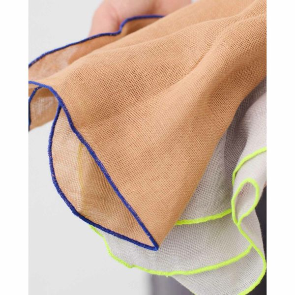 綿100%の蚊帳生地に、 カラフルな色糸で「ふちどり」をプラス。 アクセントになる配色で、さりげない個性が光るデザインです。
