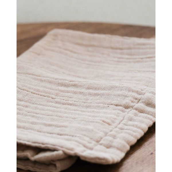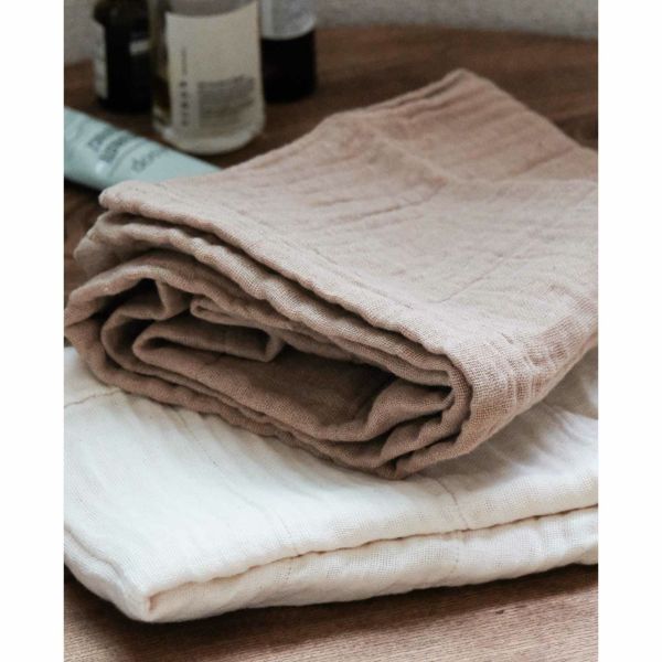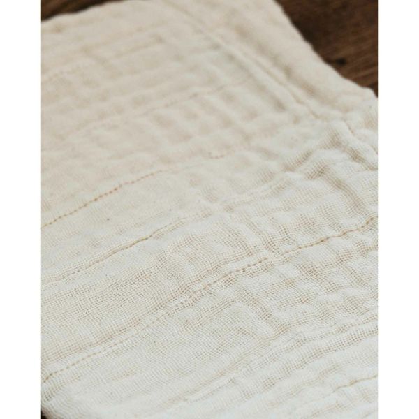 蚊帳生地の特徴である、糸と糸の間が大きく開いている織りによって水分をよく吸い取り、すぐに乾いてイヤな臭いになりにくい。洗うたびに柔らかく、ふわふわな肌触りになっていきます。