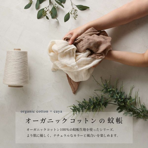 ※オーガニックの蚊帳シリーズの生地上には黒や茶色の粒が目立つことがあります。これは原材料である綿花の植物片で、漂白などの化学処理をしていないオーガニックコットンの特徴でもあります。カビや異物混入ではありませんので、安心してお使いください。