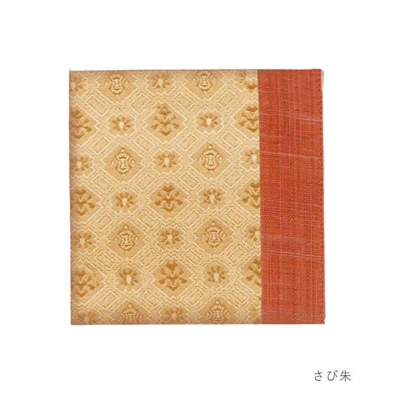 福徳を招来するものとして、縁起のいいモチーフを集めた紋様です。近くで見ると、織りによる細かな凹凸が立体感のある生地です。「けし炭」色の麻と組み合わした生地は、独特の色使いがアクセントに。「さび朱」色の麻と組み合わした生地は、単色で金糸の美しさが際立ちます。