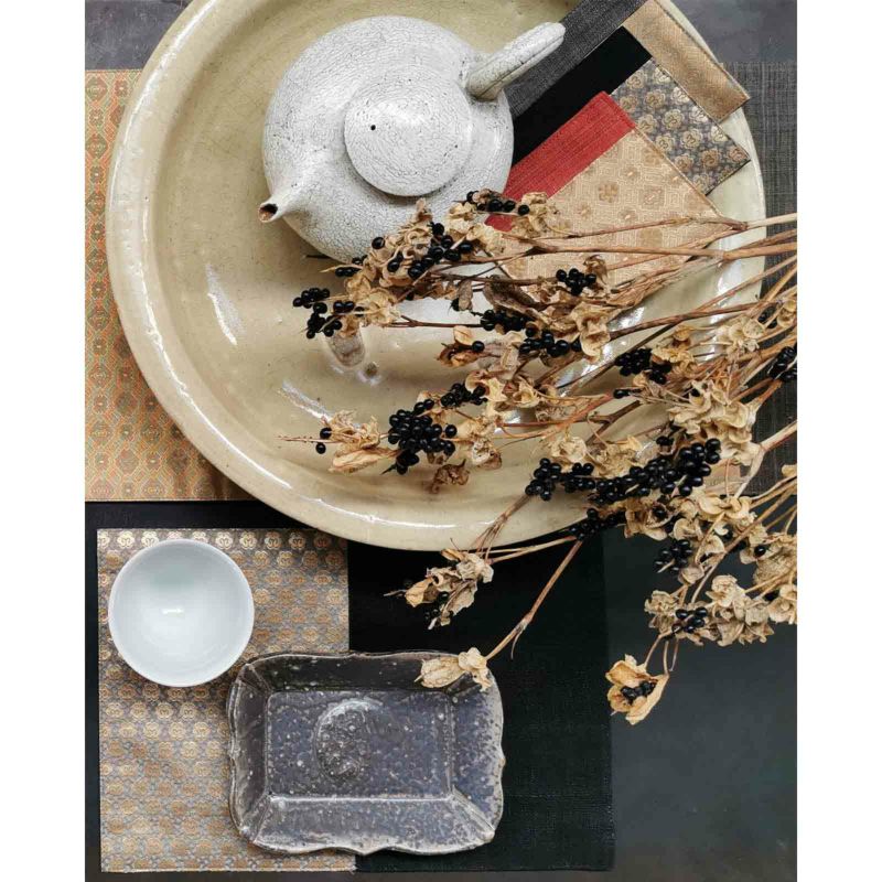 「名物裂(めいぶつぎれ)」の煌めくしっとりした柄と、表情豊かな「手紬ぎ・手織り麻」生地を組み合わせた、上品かつ華やかなシリーズです。
