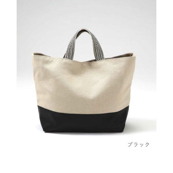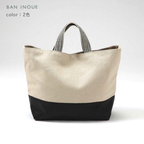 底部分には牛革を合わせ、持ち手にはモノトーンの織りテープを合わせた、ポイントの効いたシンプルながらも目を引くデザイン。
