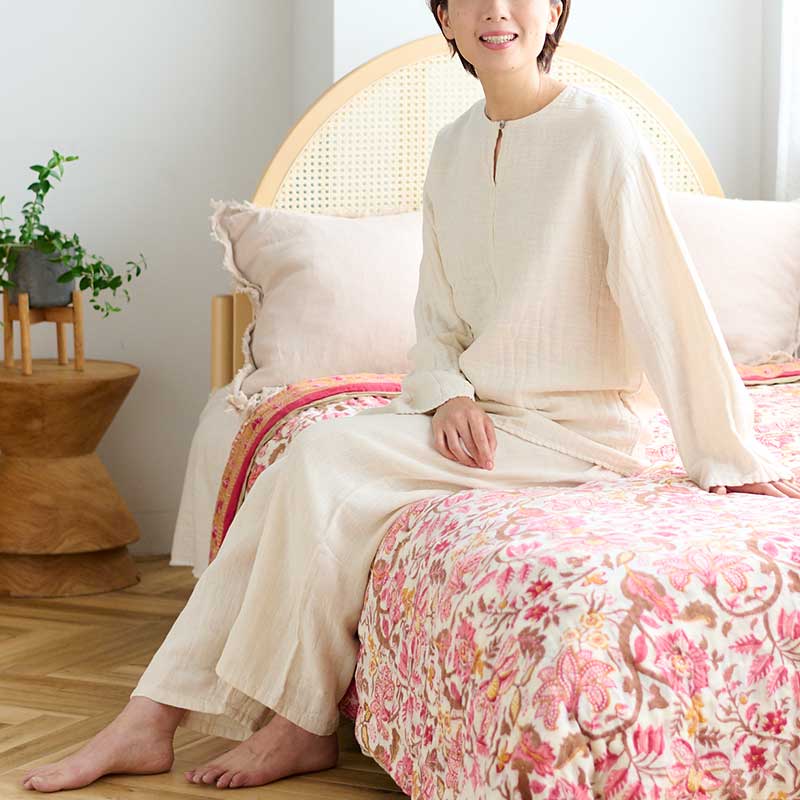 綿100%の蚊帳パジャマは、ふんわりとやわらかな肌触り。
