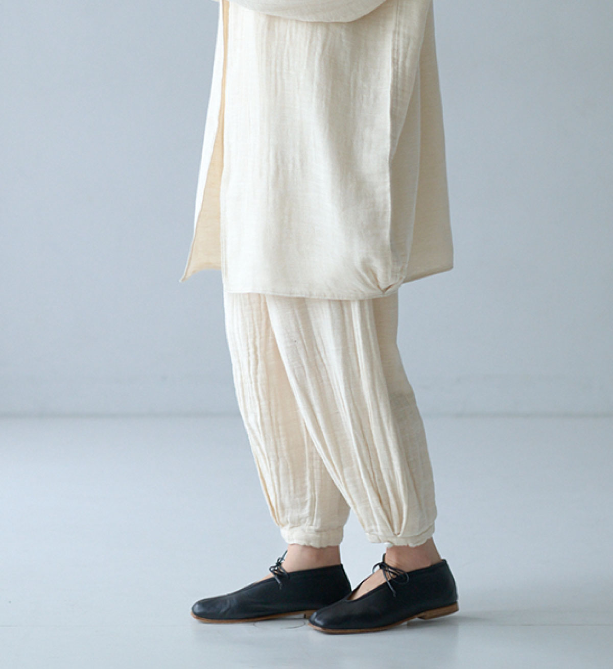 季節のおすすめは、あたたかい蚊帳生地の「スラブタックパンツ」。