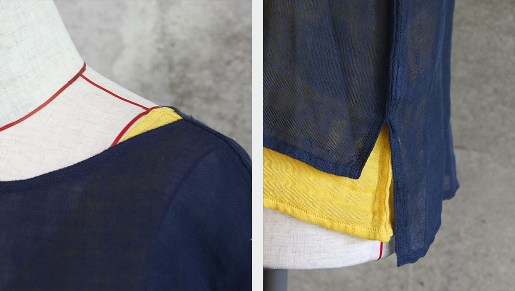 オンラインショップ限定カラーの「山吹」は、今までのモノクロ・ベージュのラインナップとはガラリと印象が違うビビッドなカラーです。肩や裾からチラリとのぞいても下着感がなく、差し色に使ったり、シンプルなTシャツの中に重ねたり…と、夏のコーディネートの中でいろいろな使い方ができそうです。フレンチトップス