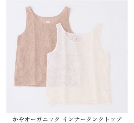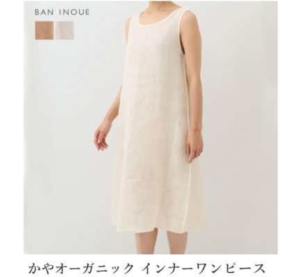 また、オーガニックコットンで織り上げた蚊帳は吸湿性や通気性に優れ、一年を通して快適に着られるのも魅力のひとつ。ワンピースの胸元からちらりと見えても邪魔しない色展開で、シンプルで飽きのこないデザインは日常使いのインナーとしても重宝します。